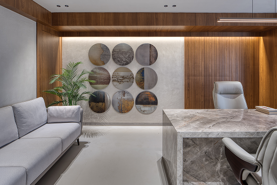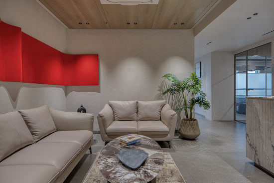 A refined corporate office defined by bold accents and clean architectural lines, thoughtfully designed to balance productivity with elevated style.