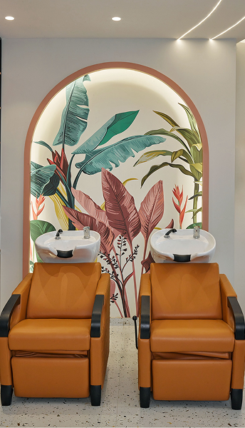 A refined salon space where warm textures and soft lighting meet elegant arches, blending comfort, style, and modern functionality.